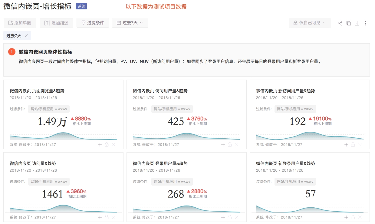 当成功通过了微信内嵌页SDK的集成流程后,在 GrowingIO 的首页里面会自动出现针对微信内嵌页的预置看板,您可以直接得到常见的流量分析报告,和页面分析报告,通过监测基础数据来获得洞察。