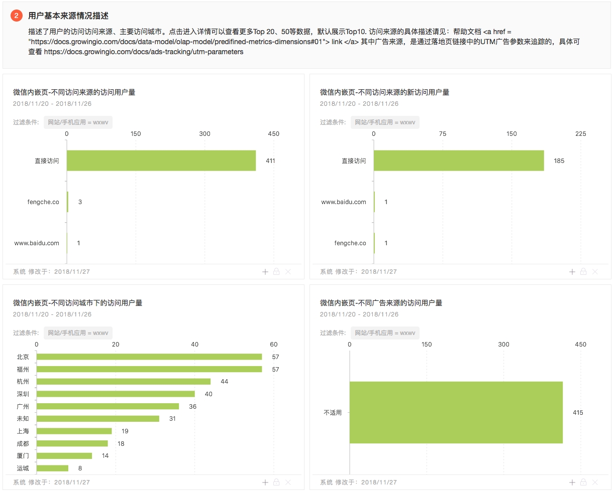用户来源情况描述:描述访问用户和新访问用户打开微信内嵌页的页面来源;其中具体的访问来源请见微信内嵌页的访问来源。