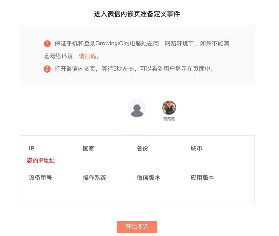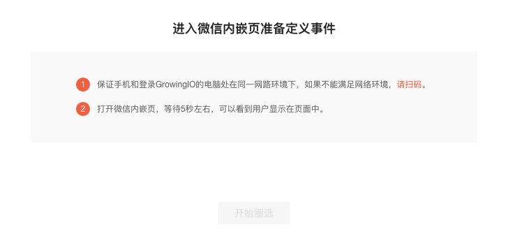 进入后,需要您进行以下操作:1、您的手机打开,处于和打开GrowingIO的电脑同一个网络环境下(公司wifi);如果不能满足这个网络环境要求,可以点击“请扫码”,打开微信,扫描二维码。