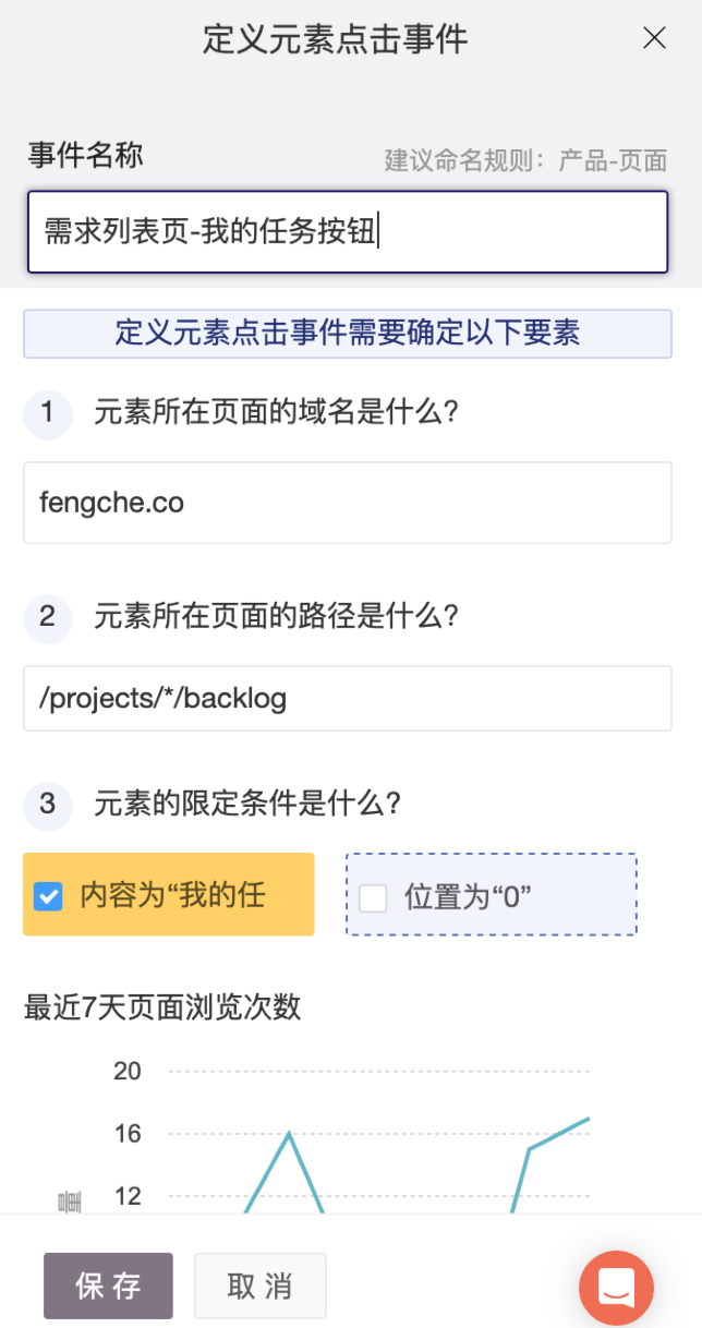 给事件命名,一般推荐按照“产品名称+页面名称”的方式来命名。然后点击“保存”。