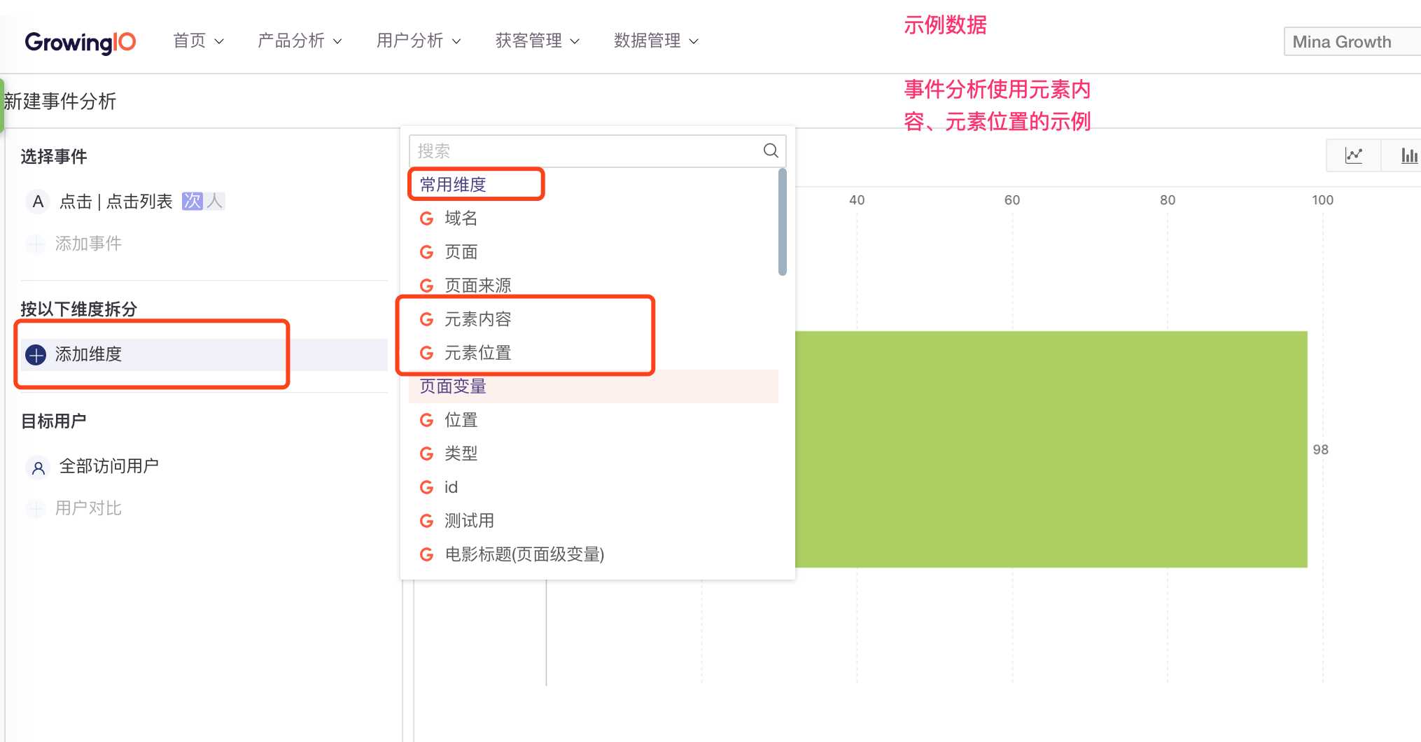 如果不勾选内容保存,则默认会将元素的文本作为一个维度。可以在维度选择、或者过滤功能中,使用“元素内容”。