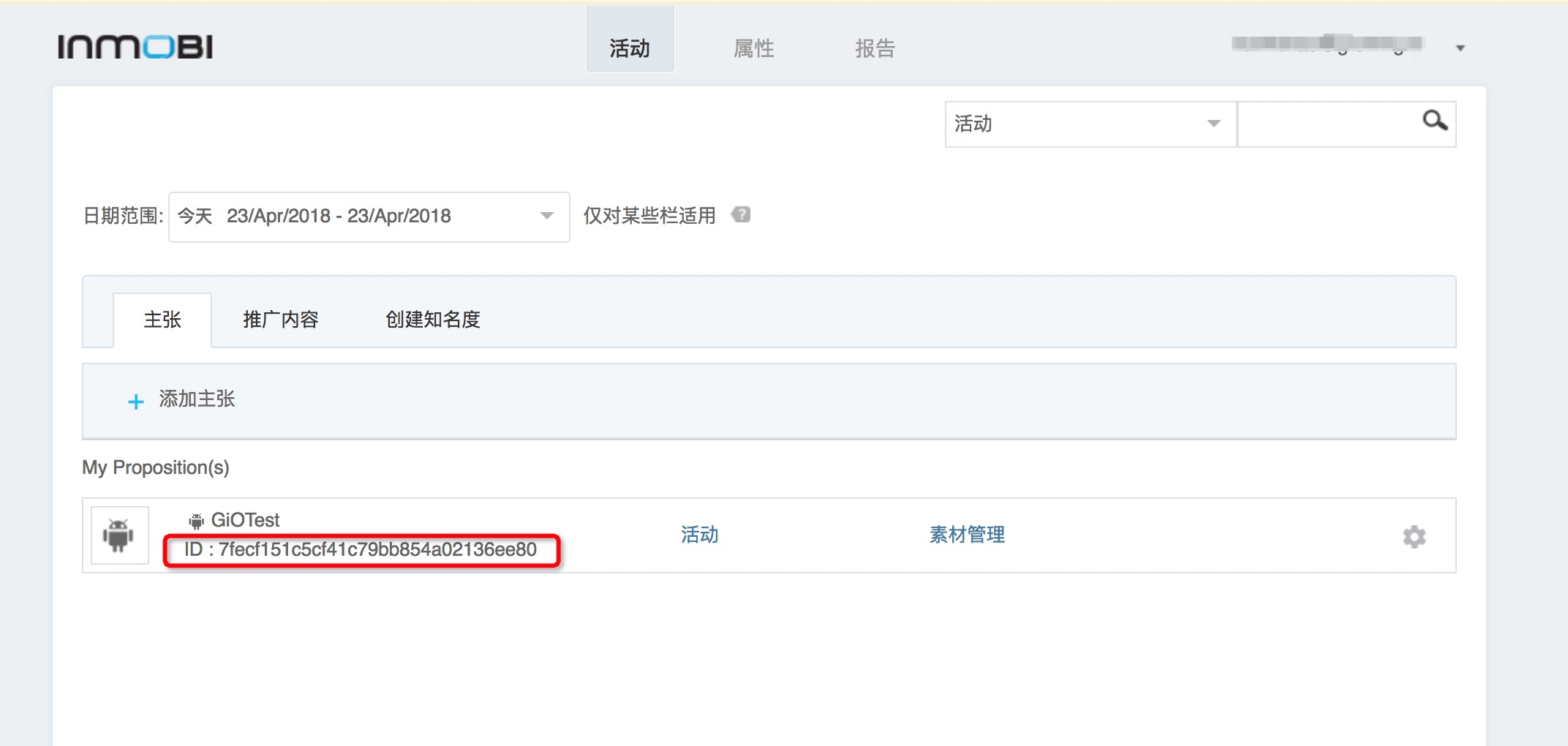 2、进入 Inmobi 后台,创建主张,选择 GrowingIO 渠道,创建成功后,将 Inmobi 生成的 ID 复制并填写到 propertyID 当中。