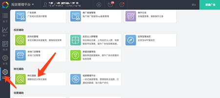 4、进入腾讯社交广告后台开始联调,在工具箱里面选择“转化跟踪”。