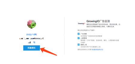 3、点击授权之后再这里进行同意授权,授权成功后,在GIO后台获取监测链接