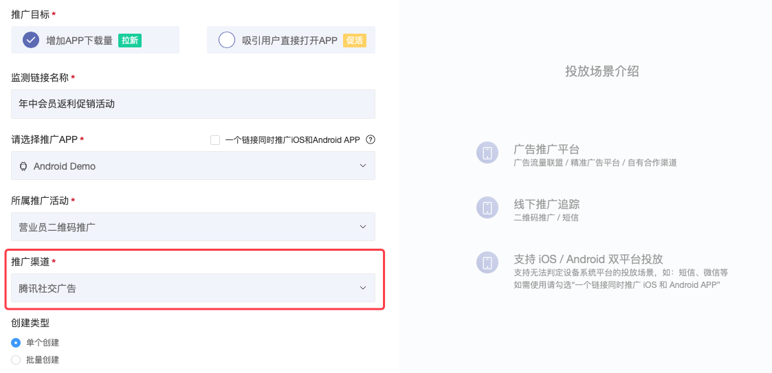 1、在GIO后台创建 App 推广链接,目标渠道选择“腾讯社交广告”,然后点击保存