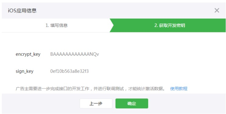 5、Feedback URL 填写完成后,获取密钥 encrypt_key 及 sign_key, 并回填至 GIO 。