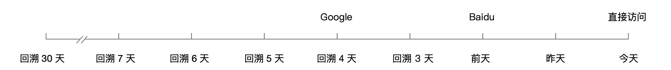 下图中,回溯 30 天,「最终非直接点击」对应的是前天 Baidu 带来的访问;因此会将本次访问的来源归因为 Baidu