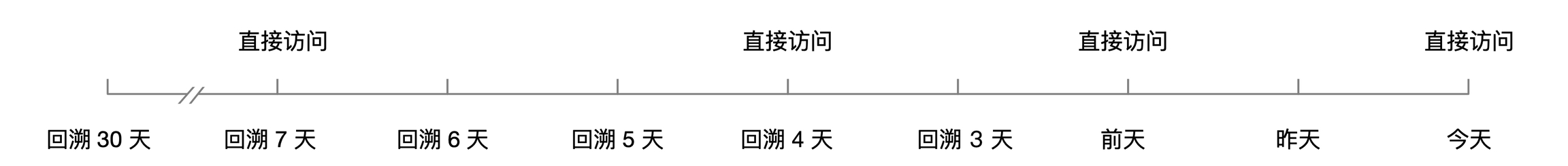 下图中,回溯30天,找不到「最终非直接点击」;因此会将本次访问的来源归因为「直接访问」