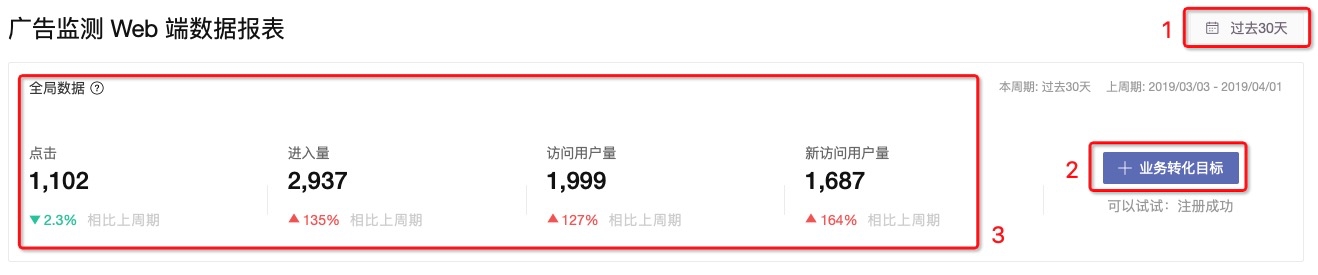 展示当前 Web 端广告投放环节的基本监控指标数据。(上图位置 3 所示 )