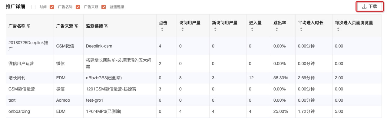 推广详细可查看各链接级别的详细统计数据,上方数据图表中展示的数据依照该推广日报。