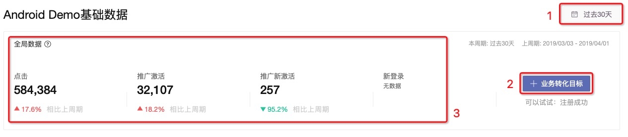 可以添加您关注的业务转化指标,该业务指标在下方图表中将作为基本的分析数据指标。(上图位置 2 所示 )