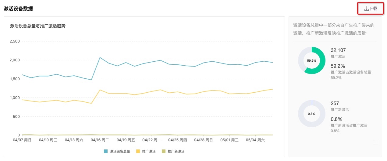 展示当前 App 下的激活数据,以线图方式展示数据变化情况,结合右侧提供圆环图,可快速了解当前推广激活占整体激活的比例,以及推广新激活在推广激活中的占比分布,方便衡量活动推广效率及活动推广质量。