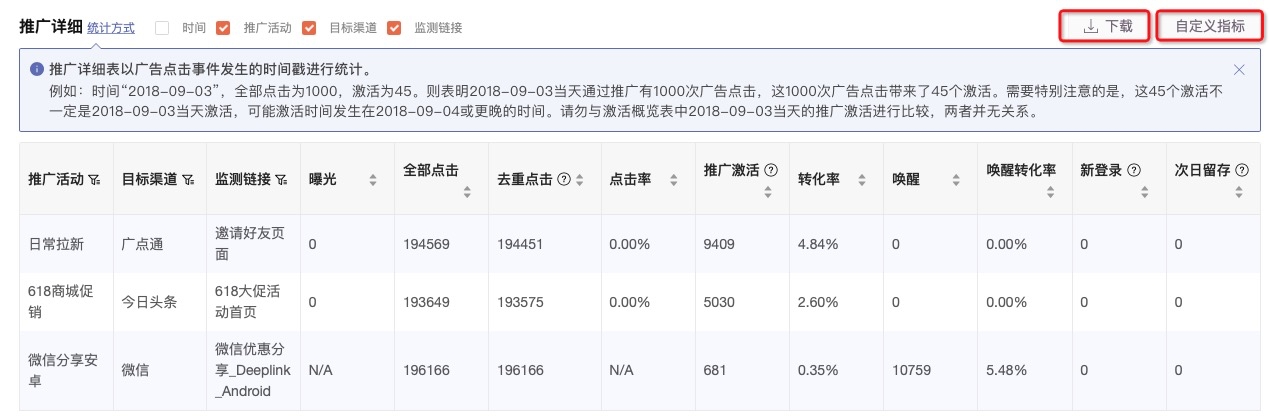 支持按统计字段聚合展示数据,支持的字段包括:时间、推广活动、目标渠道、监测链接。