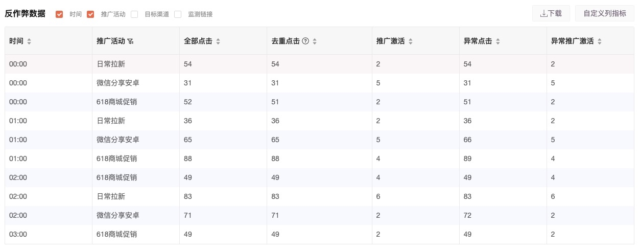 系统会针对广告投放运行一系列模型&规则识别数据的异常性,并提供相关数据报告。 1. 选中目标 App,进入“基础数据”中“异常数据报告”模块。 2. 可以根据业务诉求进行部分异常数据识别规则配置。 3. 可点击“自定义列指标”进行指标选择,可选择的列指标有:去重点击,激活,异常点击,异常激活。