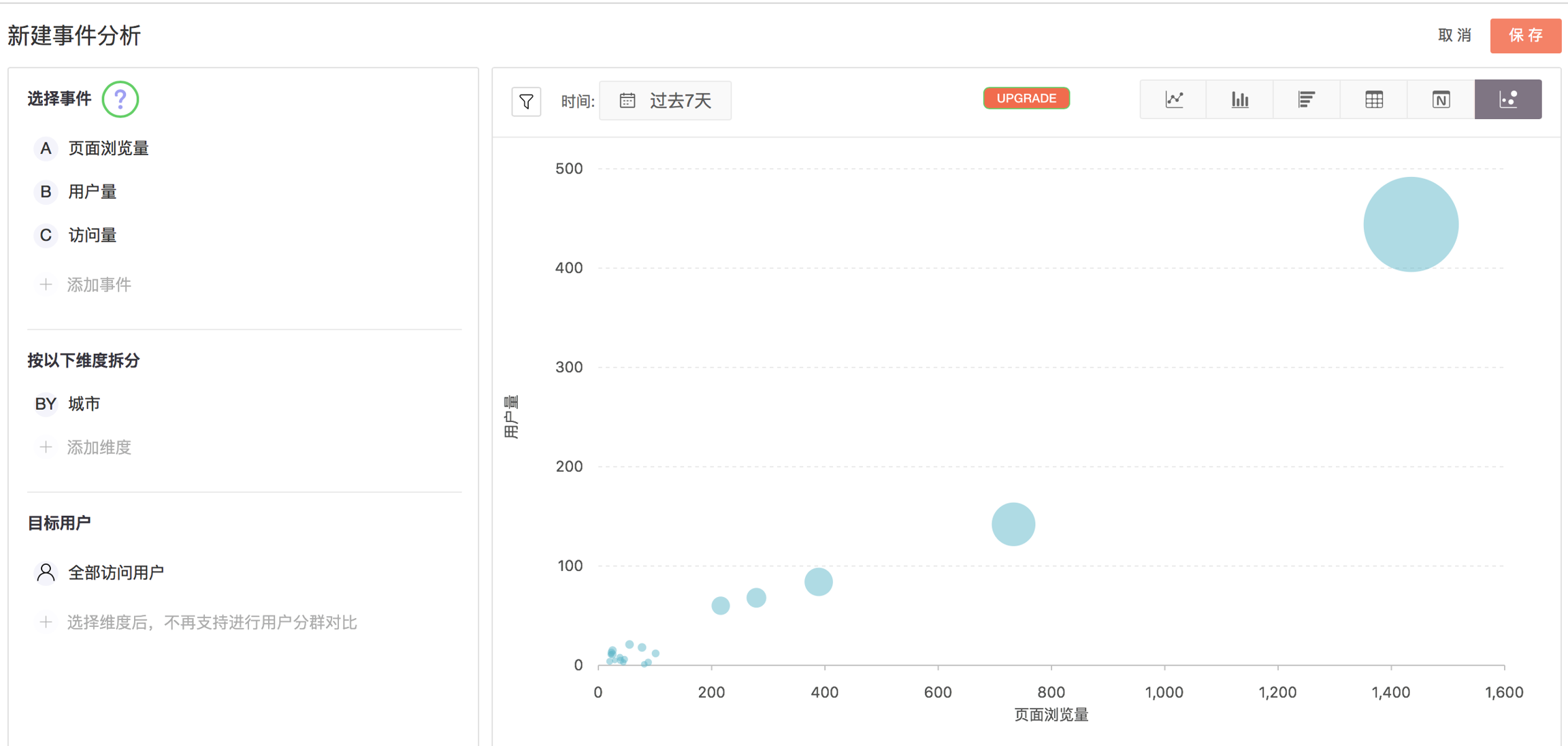 气泡图主要是分析多个事件在一个维度上之间的关系,比如油耗,速度,价格和不同的车型之间的关系。您可以分别设置 X 轴、Y 轴的具体事件,选中具体维度,再设置大小、颜色表示的事件,对时间和维度进行筛选,然后填写图表名称,保存即可。