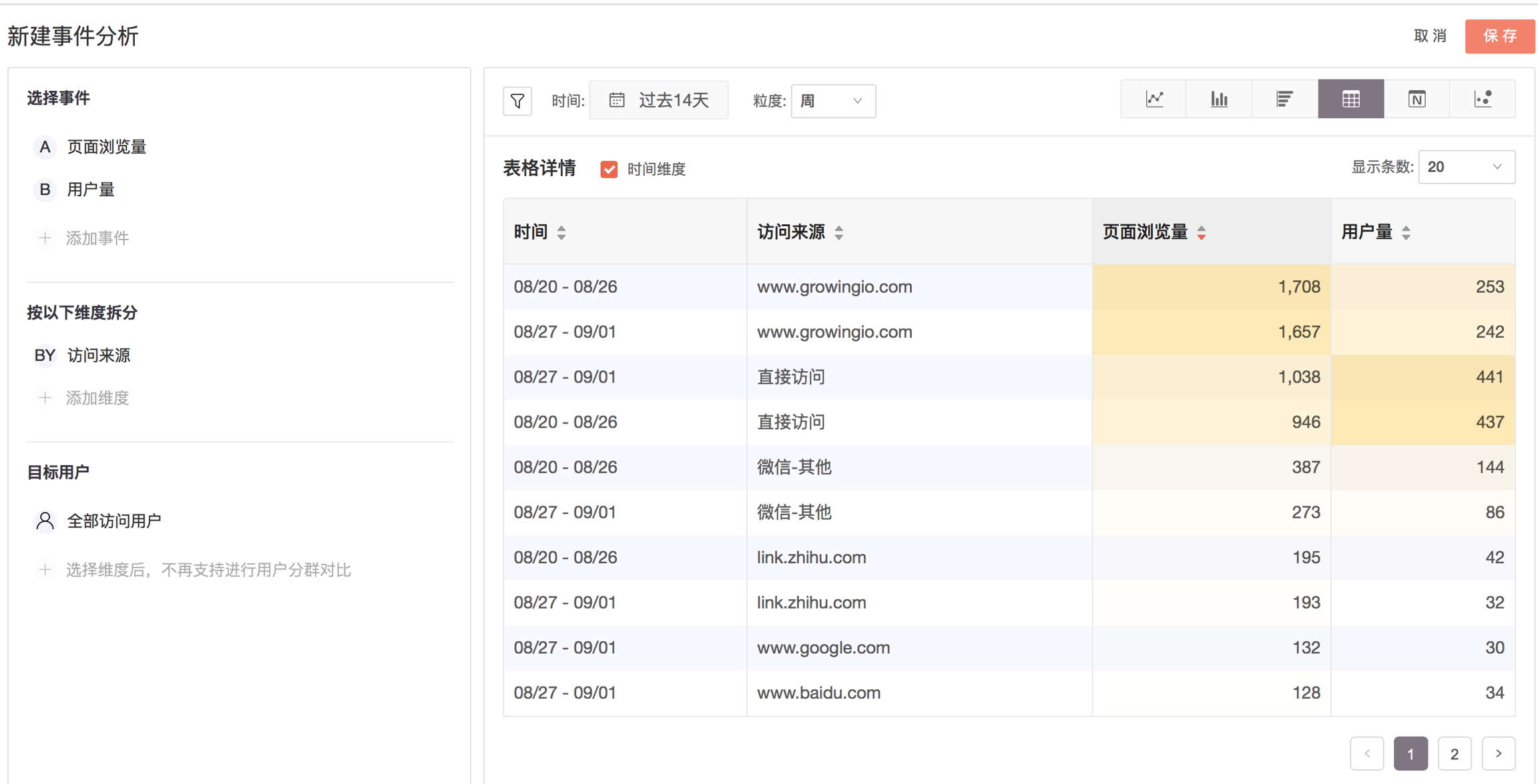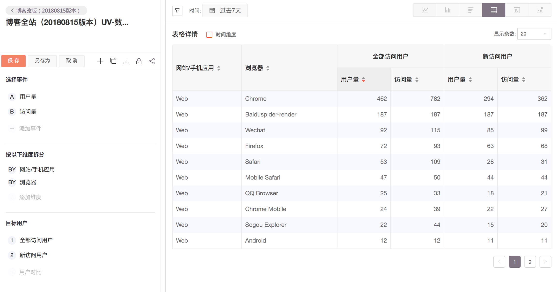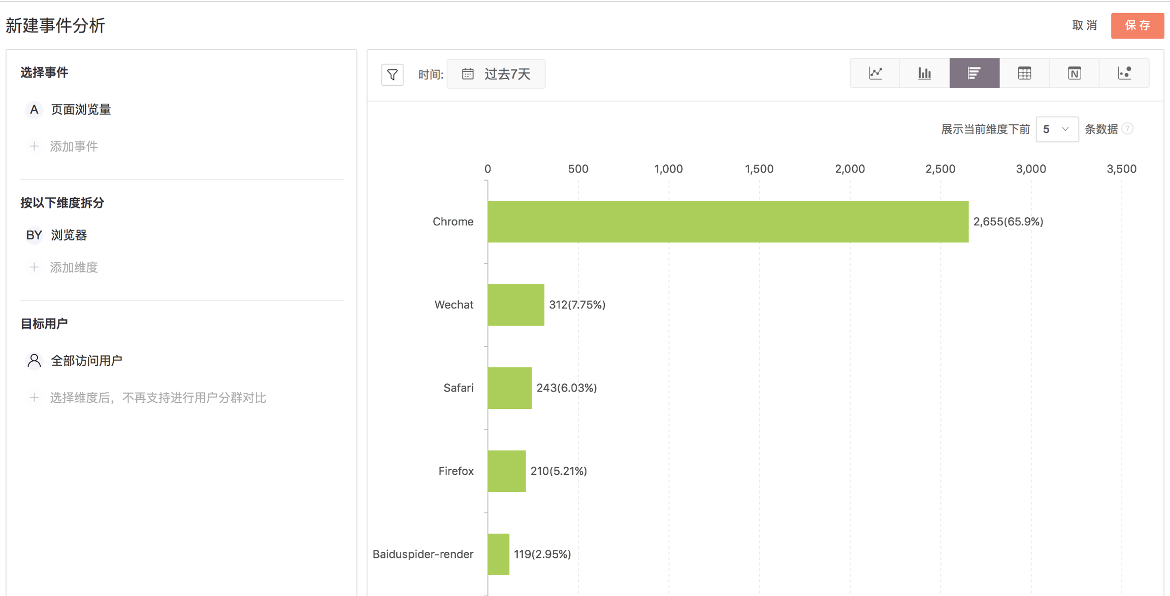 上图展示的是页面浏览量在不同浏览器下的分布。可以发现,横向柱图清晰展示了用户在不同类别上的频数,并且按照数量从大到小进行排序。在资源有限的情况下产品可以先适配 Chrome 浏览器以提升绝大部分用户的体验。 常用来细分的维度,如浏览器,操作系统,城市,App 版本,设备型号,广告来源等。 应用:您做了渠道推广后,希望查看不同访问来源的访问用户量,可以选择指标为“用户量”,维度选择为“访问来源”。