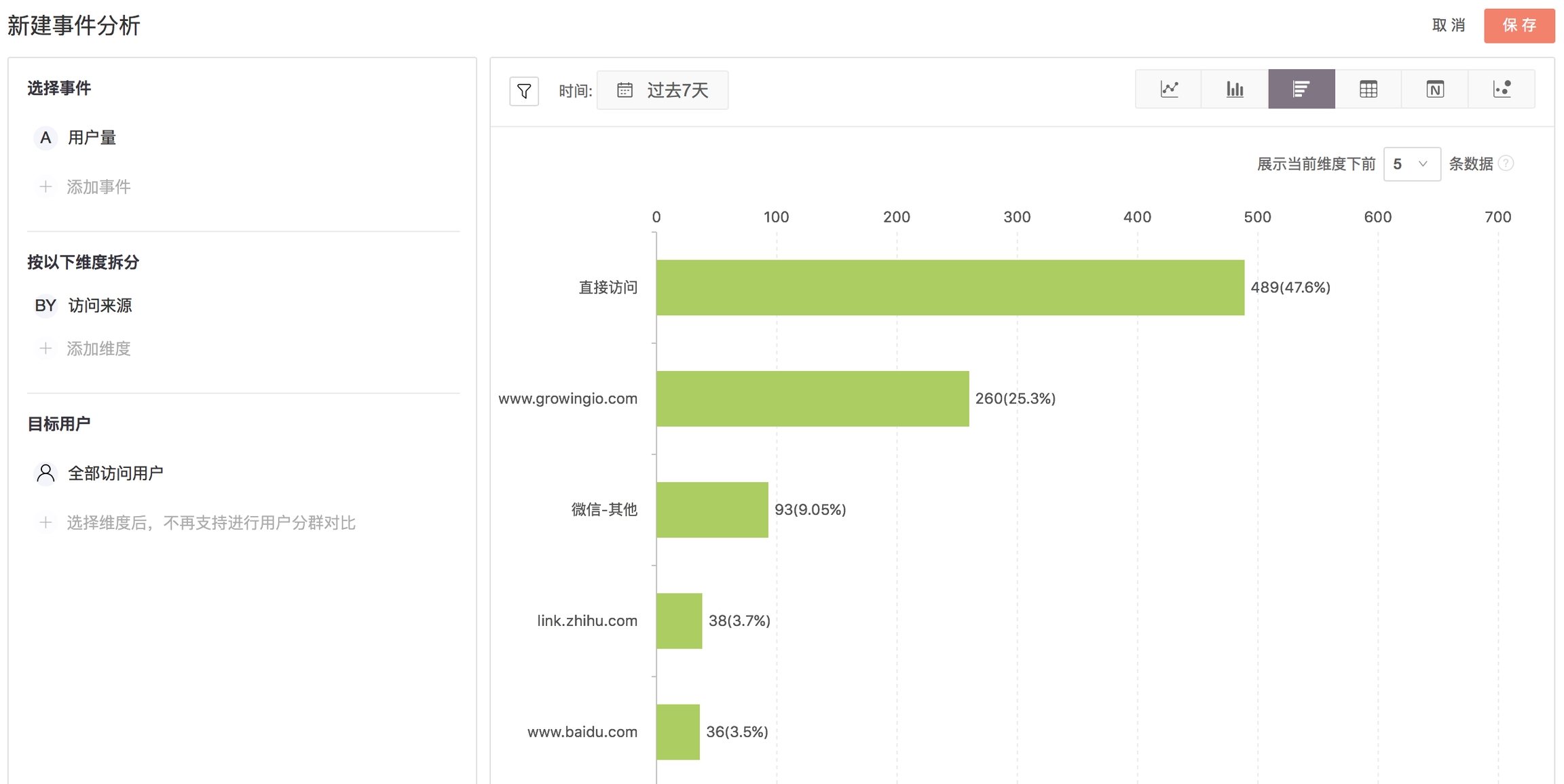 可以看到上图显示的是:在过去 7 天内访问用户数总量前 10 名的访问来源按照降序显示出来,您可以判断哪些是高质量的渠道。