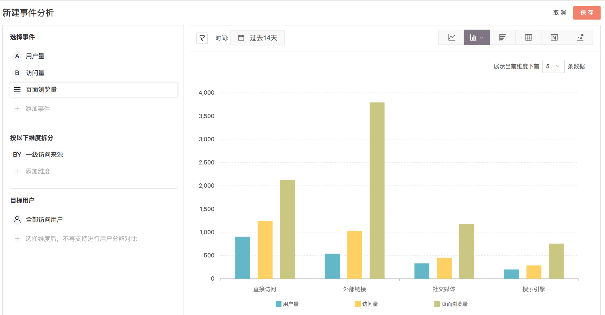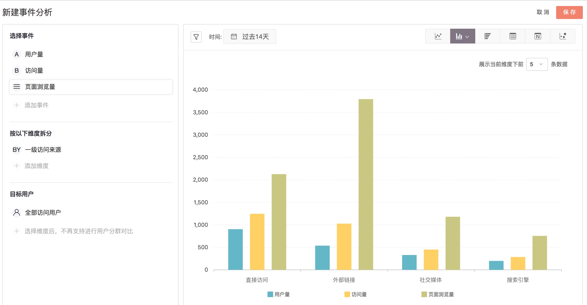纵向柱图主要用于分析和对比各类别之间的数值大小 ,其中横轴表示需要对比的分类维度,纵轴表示相应的指标数值。您可以通过纵向柱图分析一个或多个指标在特定维度的分类表现。例如,产品经理和运营人员可以使用纵向柱图分析过去一段时间内不同访问来源过来的流量表现。