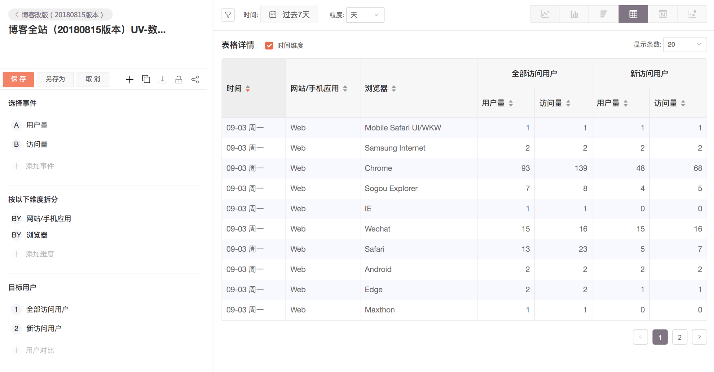 表格是信息最密集的呈现方式,可以同时分析多指标和多维度的数据,您可以选择指标和维度,然后设置时间范围和展示粒度,可以进行维度过滤。