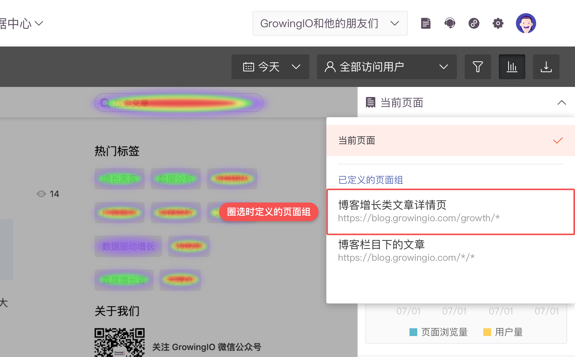 用户:选择用户分群,查看不同人群在所选页面的热图表现。