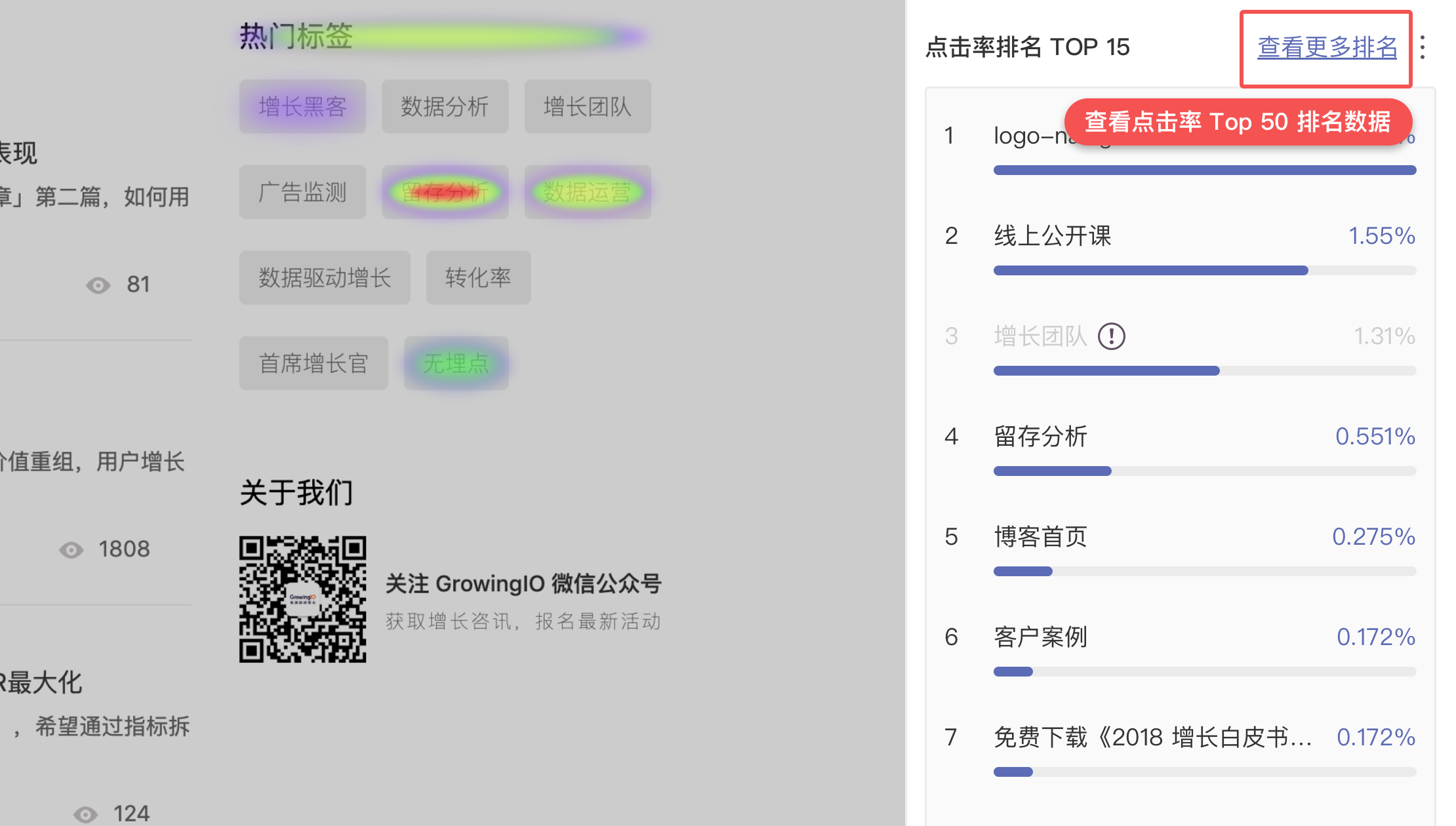热图详情数据中可查看所选页面中点击率前 15 的元素。点击「查看更多排名」可以查看点击率前 50 的元素排名列表。