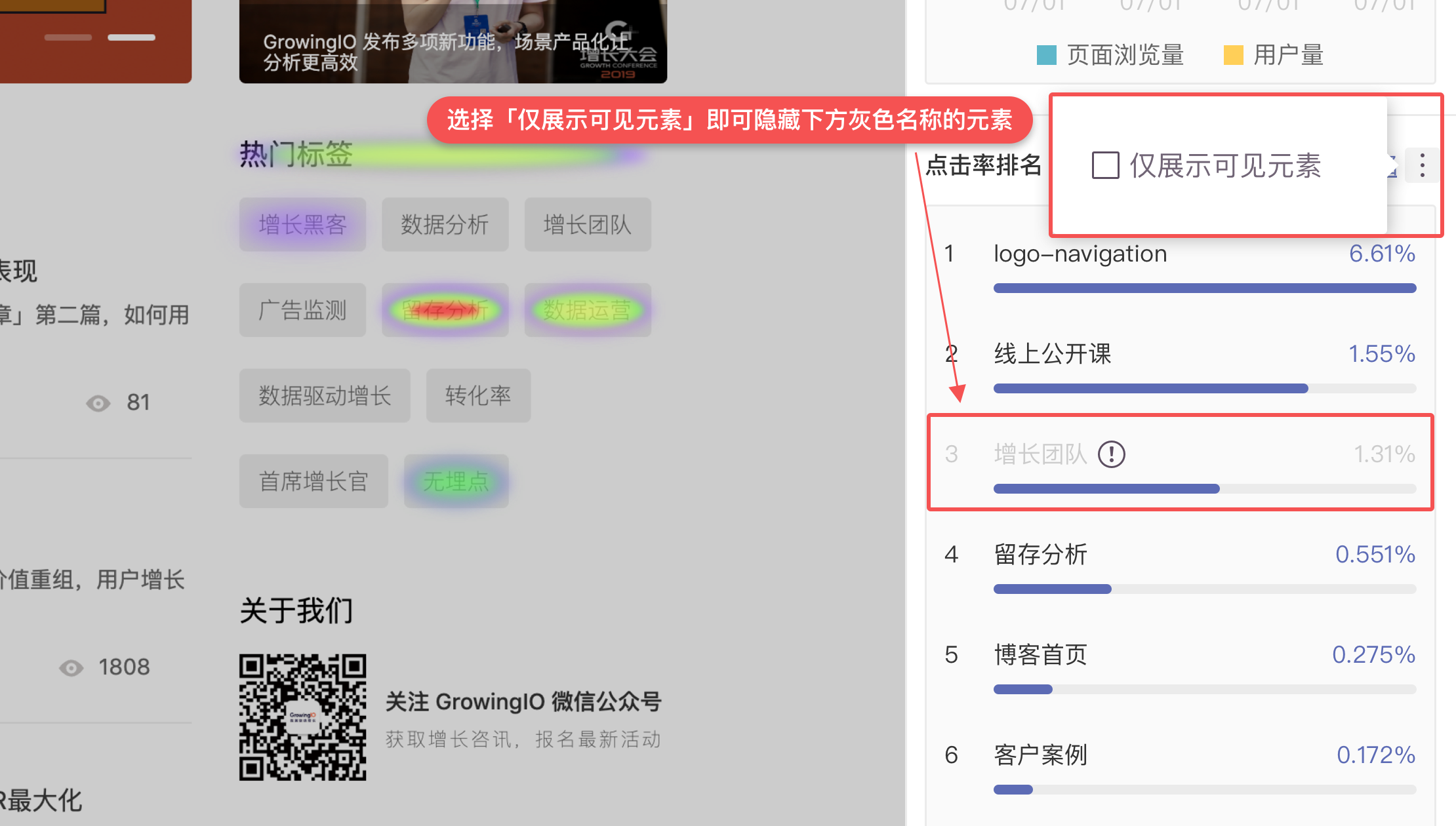 在所选时间、所选页面内,该元素曾被点击,但是存在于当前页面的一些下拉菜单或者弹窗(需要交互才能展示出来的内容)中,因热图数据是依据当前 URL 一并绘制的,因此它们在列表中,但是所在的下拉菜单或者弹窗未展示出来,因此不可见。为了消除干扰,您可以点击这里的按钮选择「仅展示可见元素」隐藏不可见元素,其他元素会仍按照点击率排名进行展示。
