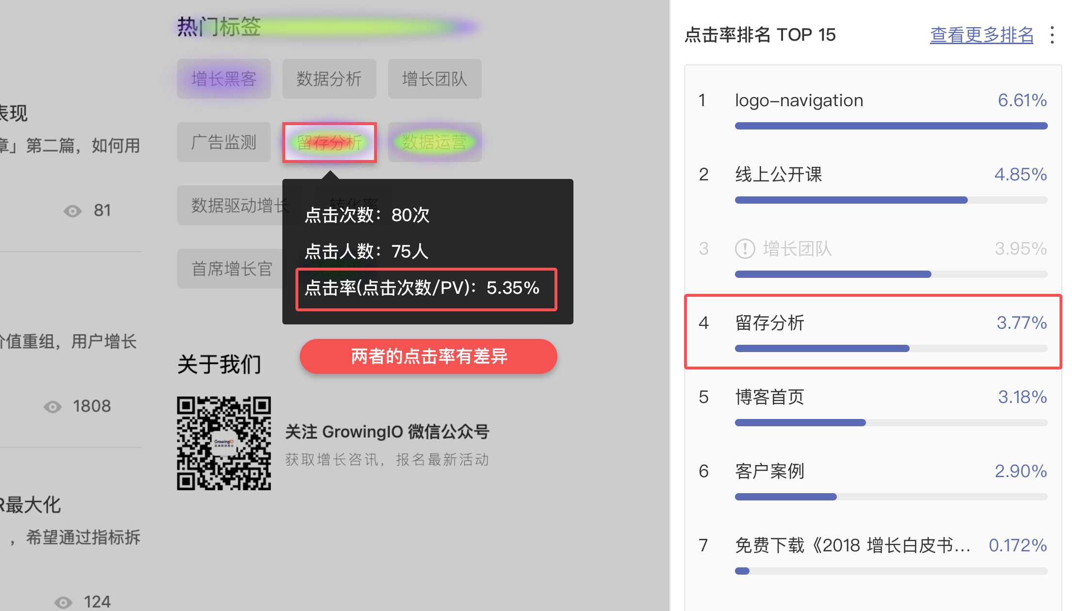 4. 部分情况下会出现点击率排名列表中的元素点击率与页面中展示的点击率有差异,如下图所示。