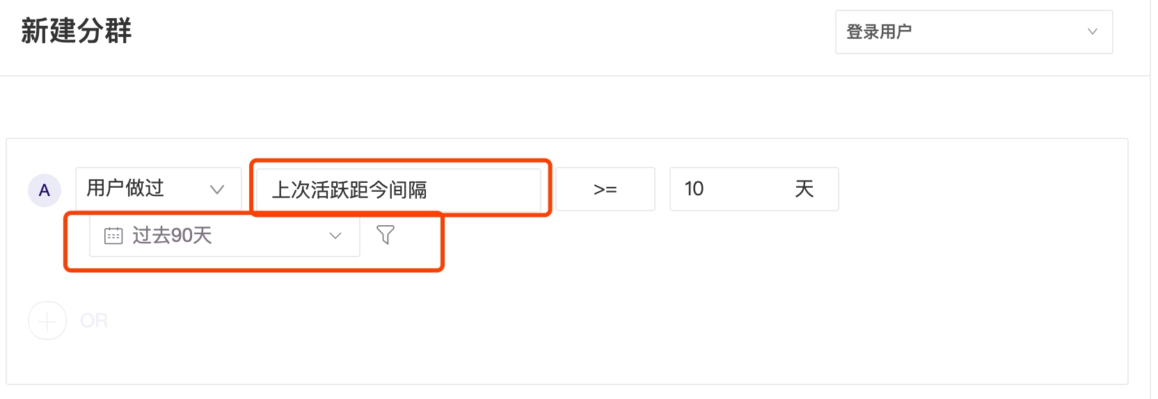 1.时间范围为第一层逻辑,然后计算上次活跃距今日时间间隔 X 天。例如下图,即「过去 90 天有过登录的用户」中,上次活跃距今间隔10 天及以上的用户是谁。