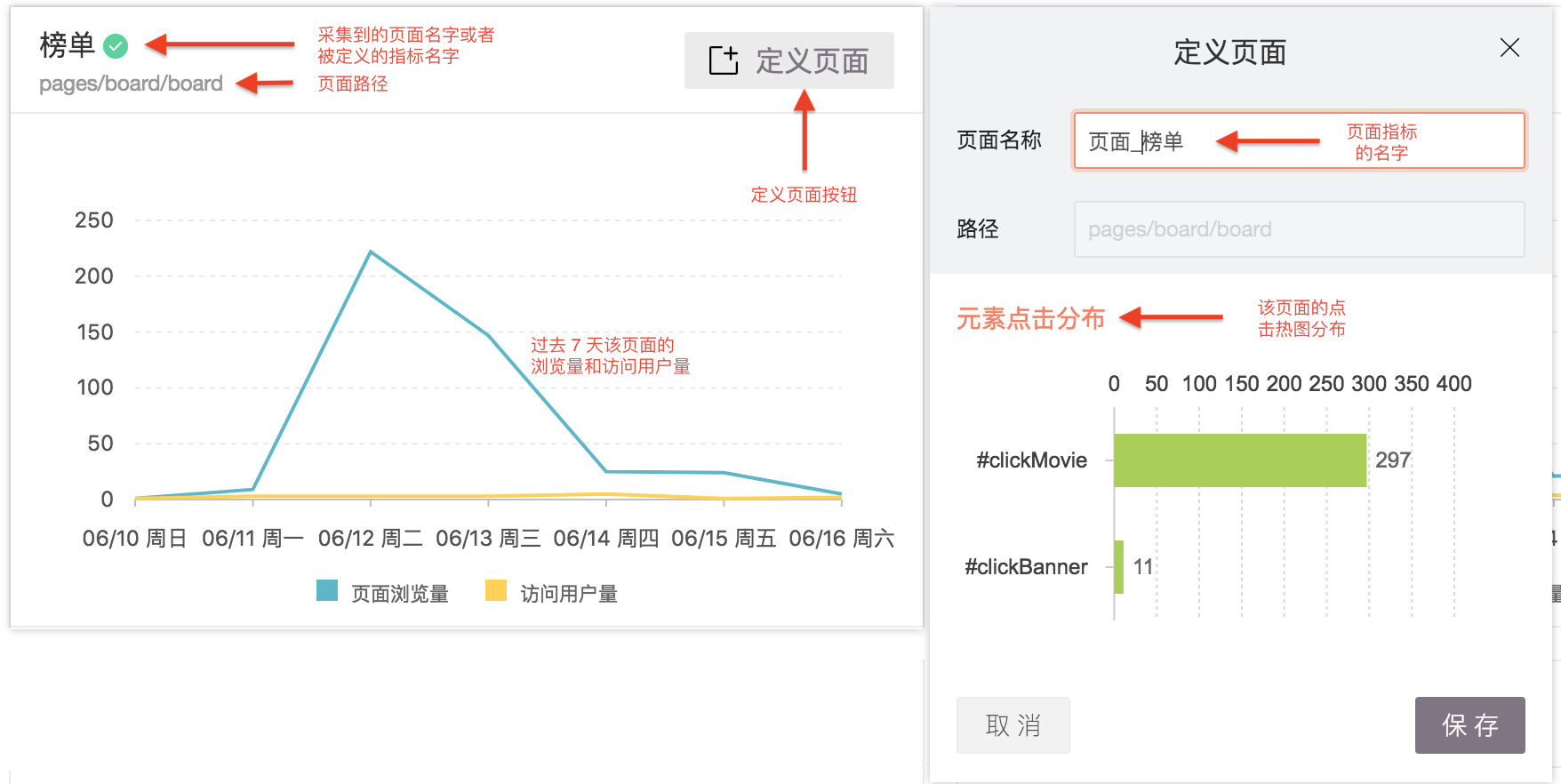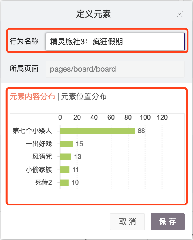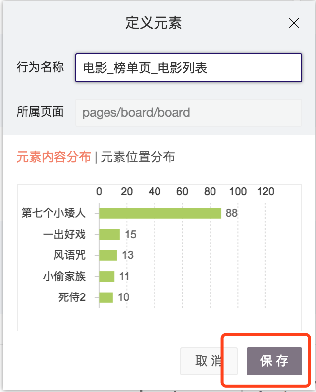 同理定义一个页面,点击“定义页面”,展示出定义页面的弹窗,“元素点击分布”tab上,展示这个页面上所有元素的点击分布,如果页面上没有可点击的元素,则显示为空。给页面定义一个名称(如果您集成了多个项目,建议您可以采用以下的命名建议:小程序名称_页面“来命名页面),保存。