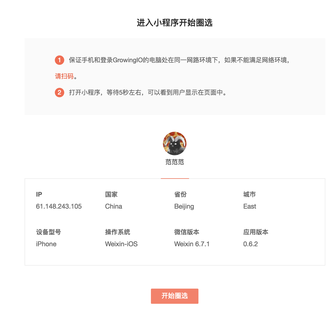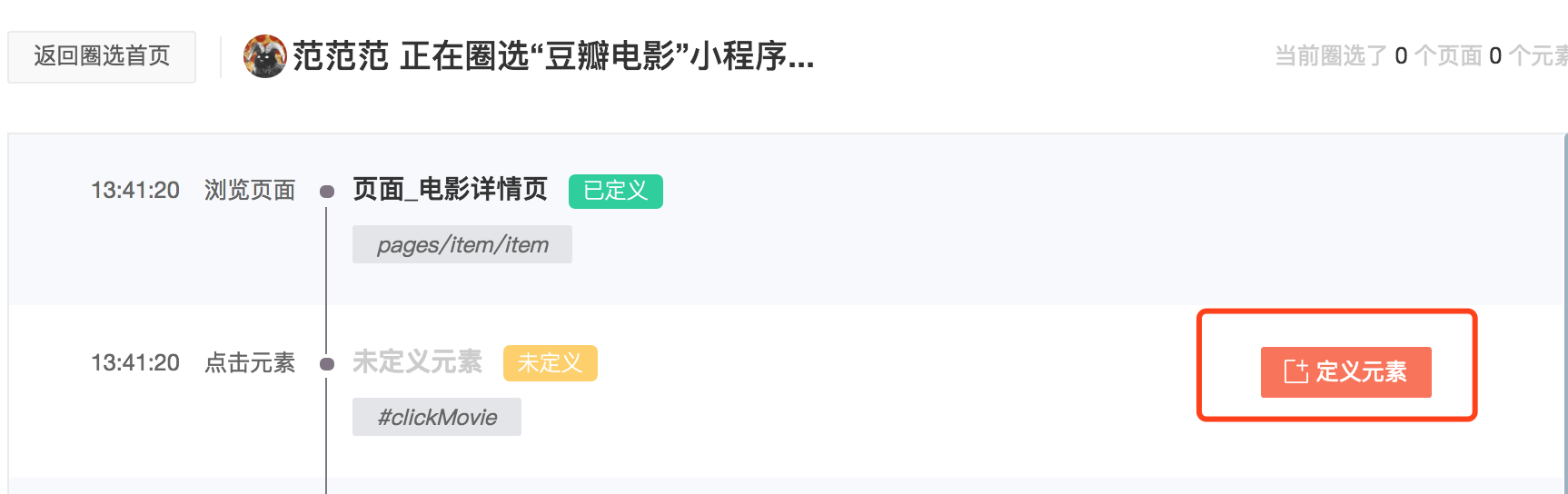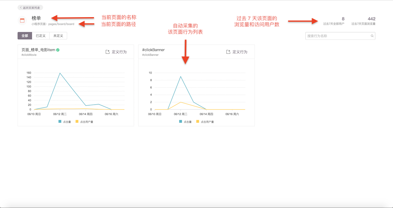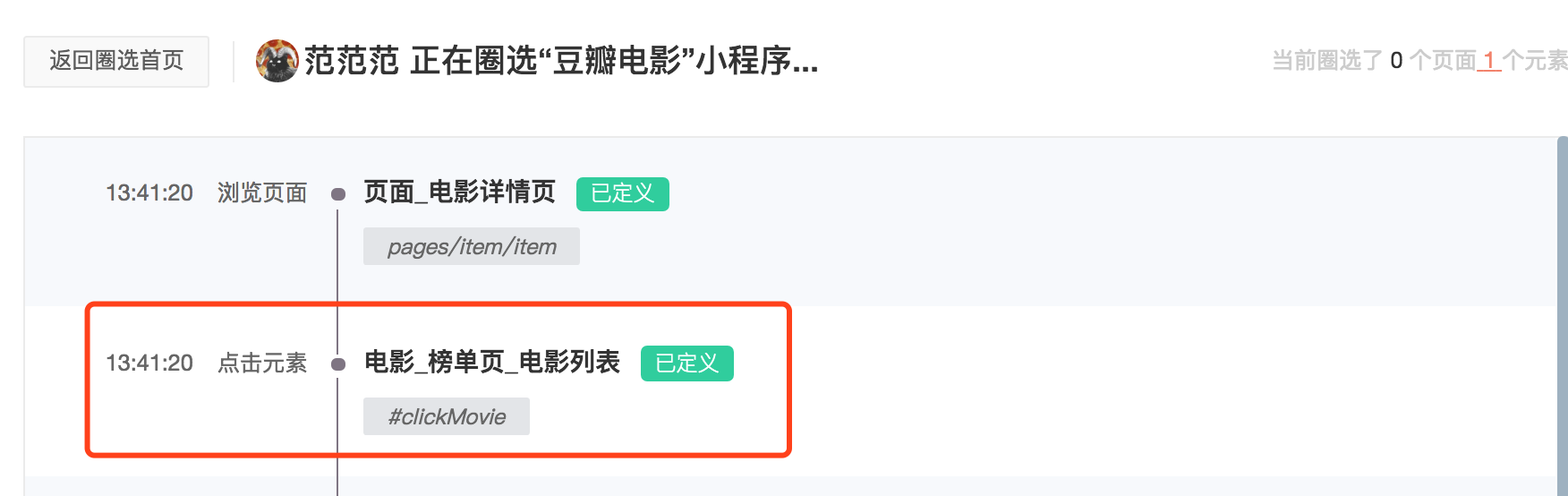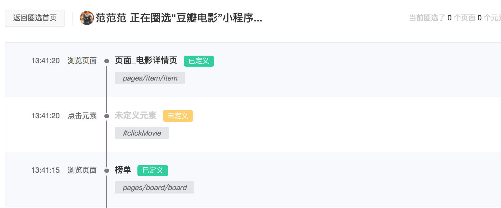在这个页面中,在微信小程序上实时操作,你的页面浏览或者元素点击事件的行为流会实时的显示在页面上。如果这个行为指标已被定义了,就会显示已定义标识和指标的名称。