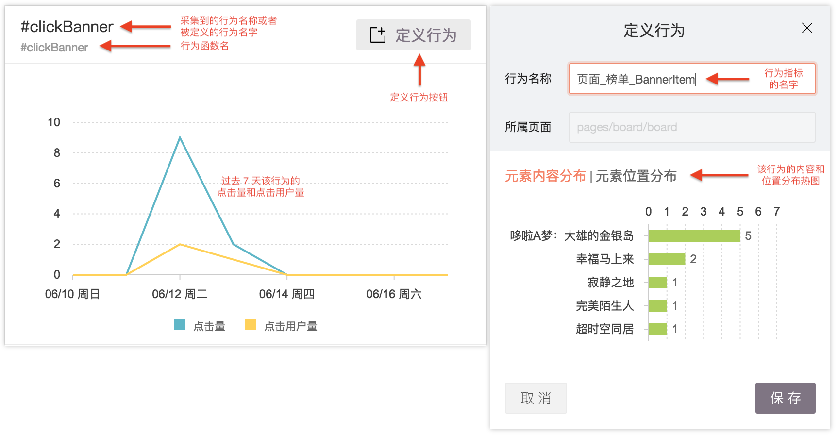 这里值得注意的是元素内容分布和元素位置分布,显示的数据是在这个页面,行为被点击/输入时,对应的内容和位置的交互热图分布。在无埋点采集事件里介绍了,如果在视图里使用了 data-title 和 data-index 这种声明式编程,就能在行为数据里看到这些数据。