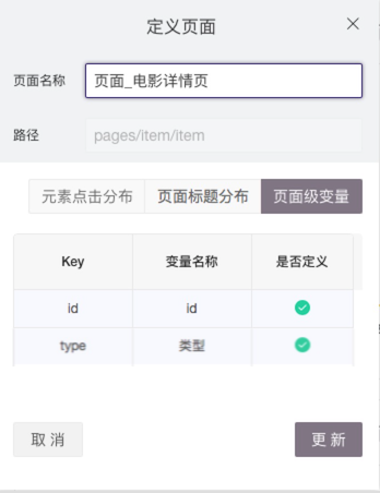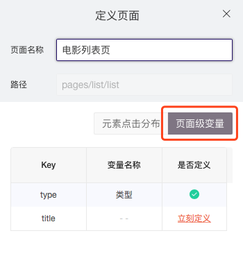 在定义“浏览电影列表页事件”的时候,可以定义页面路径 pages/list/list 的页面 ;进一步,想了解具体浏览的是什么类型和分类时,就可以通过“页面级变量” 的功能来实现定义。