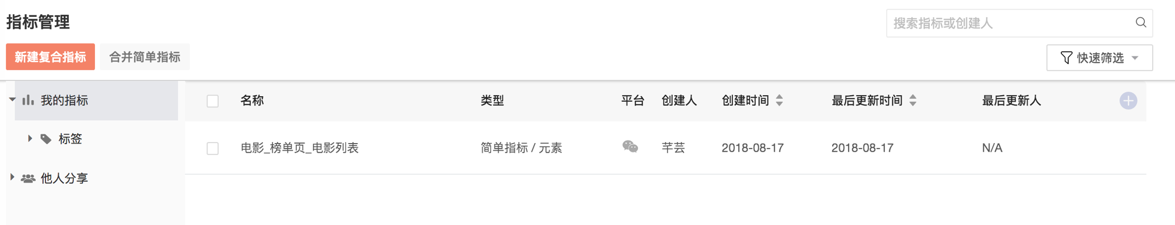 定义完后的指标,会出现在“数据管理-无埋点事件管理“功能页面中。可以根据创建人、以及右上角的快速筛选等信息的查看。