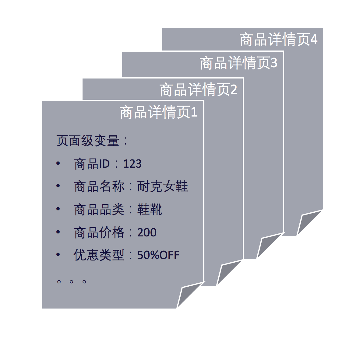 常用于商品详情页、搜索结果页等由同一个模板(类)填充的多个页面,以便区分这些页面间不同的业务含义。例如商品详情页可用页面级变量来标记:商品名称、物品ID、品类、价格等信息。如图示: