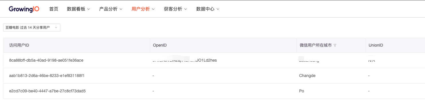 如果您项目中已经集成了 GrowingIO 小程序或者微信内嵌页应用,请麻烦工程师参照文档检查一下是否上报了微信 openid 和 unionid;或者可以在「用户分析」- 「用户细查」列表中查看是否有 openid 、unionid上报。测试数据示例