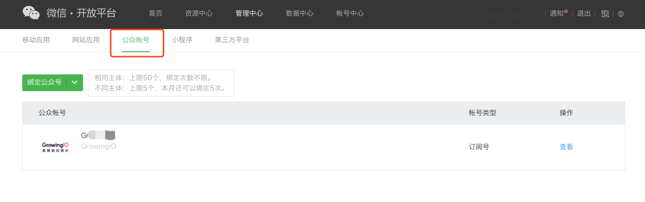 进入「管理中心」,点击“公众账号”,点击“绑定公众号”、“绑定小程序”,按照步骤进行公众账号的绑定(公众号和小程序的管理员有绑定权限)。