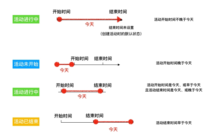 用户通过时间选择器来选择活动的时间区间,时间区间与今天的关系生成状态: a.活动开始时间的一定不晚于活动结束时间,颗粒度为天。(活动开始时间和活动结束时间可以是同一天) b.用户可以设置开始时间为未来,也可以设置结束时间为未来。 c.当活动开始时间晚于「今天」时,则状态为活动「未开始」,(用户设置开始时间为未来)。 d.当活动开始时间早于「今天」(或是「今天」)且活动结束时间晚于今天(或是今天)时,则状态为活动「进行中」。(用户设置结束时间为未来) e.当活动结束时间早于「今天」,则状态为活动已结束。