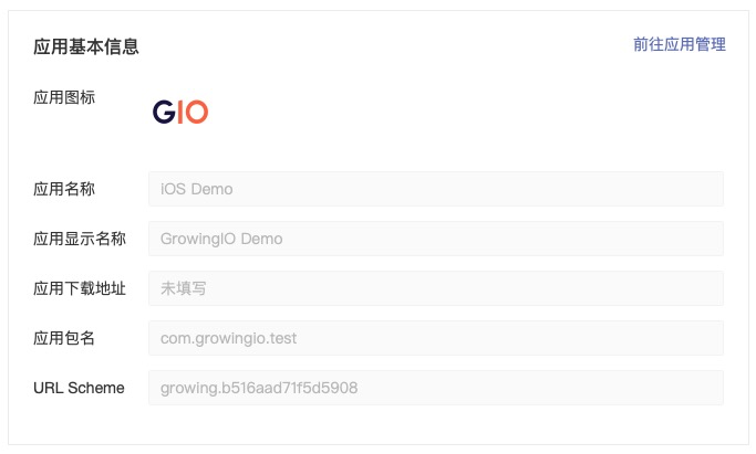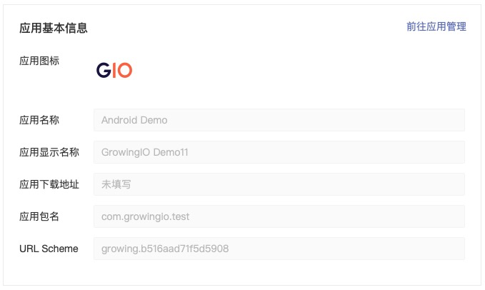 其中包含当前应用的基本信息配置,如果您需要更改此处信息,请单击「前往应用管理」进行更改。