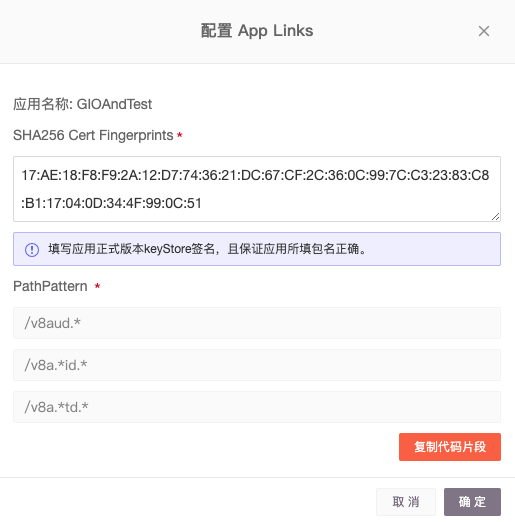 GrowingIO 暂不支持自定义 App Links 的 host,请不要修改复制的代码块中的 host;