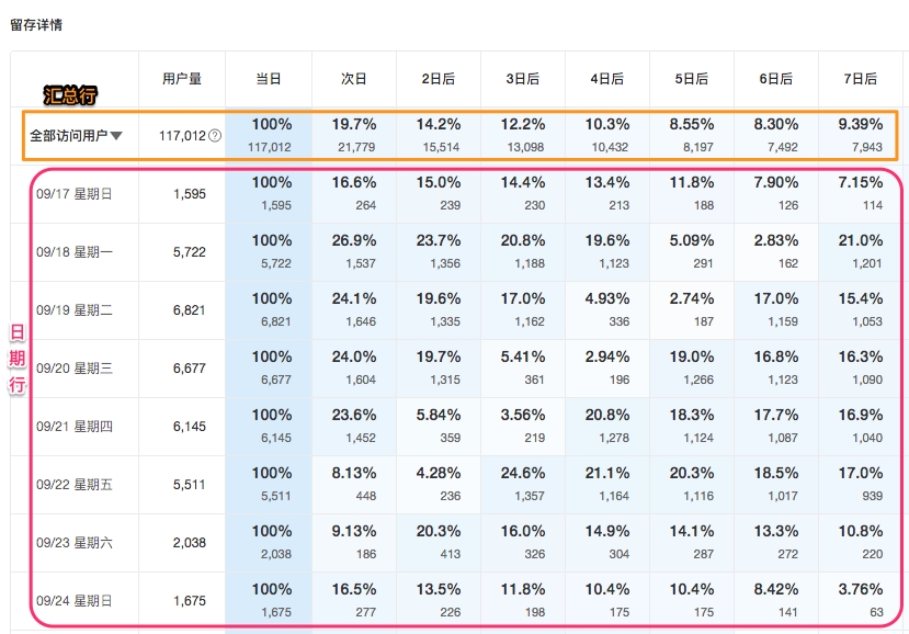 下面,我们把留存表分成 "汇总行"和"日期行":