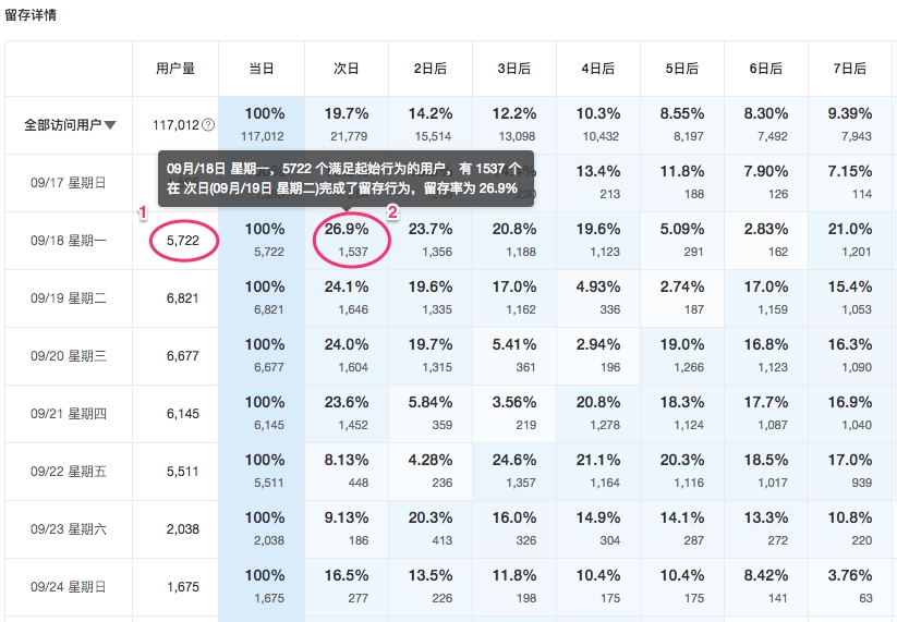 26.9%:这个是日期行的留存率图中的留存率数据。 Tips 给出了统计口径;5722 个满足起始行为的用户,有 1537 个用户在第二天(09月/19日)完成了留存行为。次日留存率的计算: