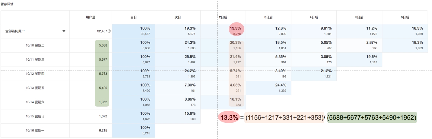 12.2% = 每个日期行 "3日后" 列的用户量算数相加/ 对应每个日期行 "用户量" 列的用户量算数相加