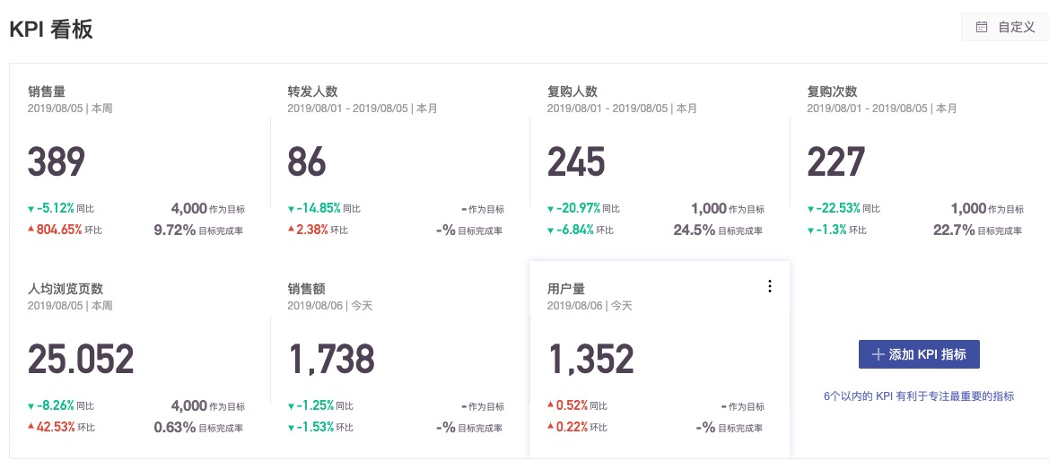 我们将销售量、销售额、用户量、复购、转发等放在KPI看板。您打开KPI看板后,借助大数字图,所有核心指标表现一览无余,帮您迅速了解整体表现和有异常的 KPI。比如,我们可以看到下图中复购次数这个KPI出现了问题。同比出现了超过20%的下降。