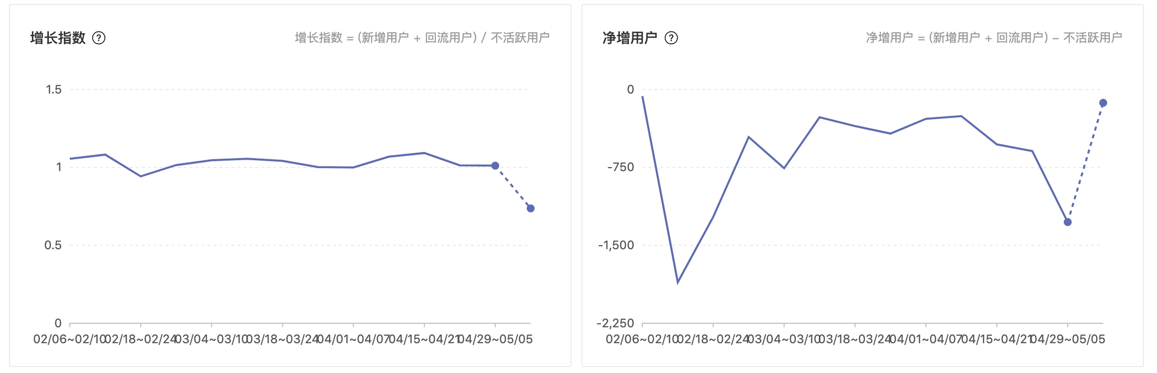 增长指数 =(当期新增用户数+当期回流用户数)/ 当期活跃但是在下周期不活跃的用户数