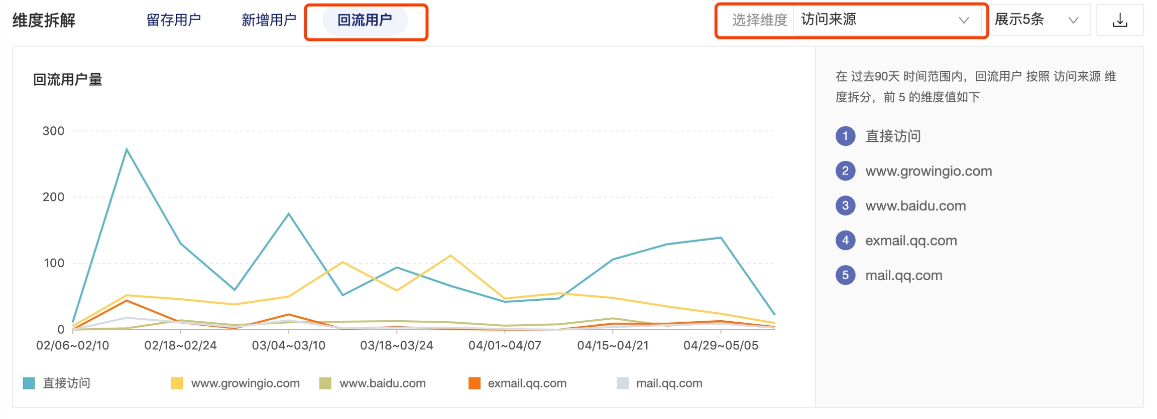 例如,选择回流用户,选择用访问来源拆分,可以知道不活跃用户再次活跃的用户来源。 2的