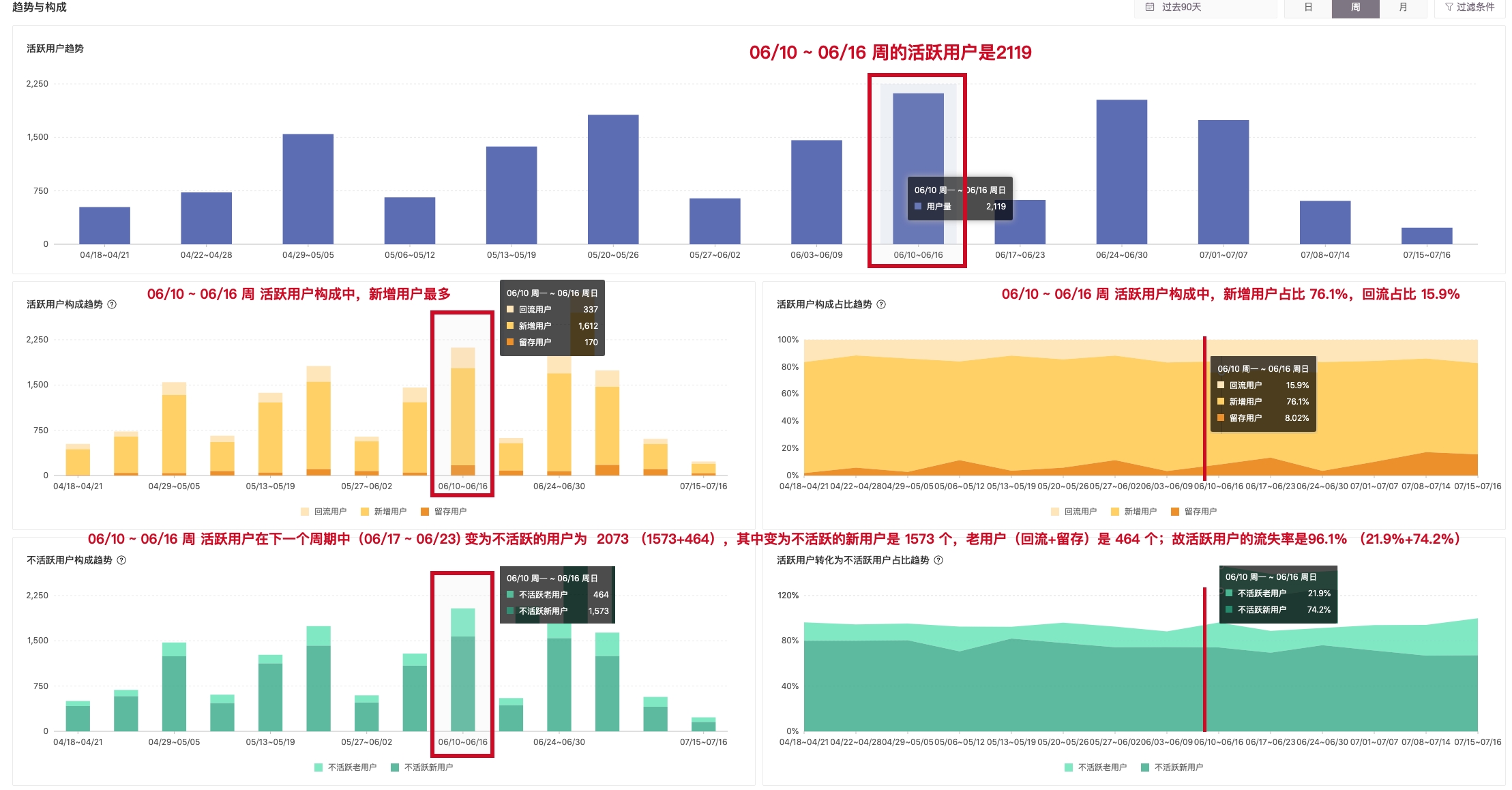 这个部分需要几张图一起解读,就可以非常清晰的了解活跃用户数量、构成、占比、以及在下个周期变为不活跃的变化情况和趋势。